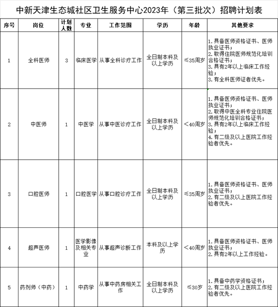 中新天津生态城社区卫生服务中心2023年(第三批次)公开招聘公告