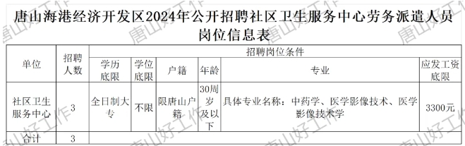 唐山海港经济开发区2024年公开招聘3名社区卫生服务中心劳务派遣人员公告