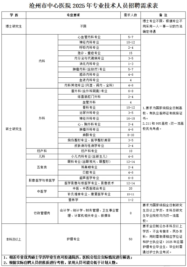 具体岗位需求详见附表《沧州市中心医院2025年专业技术人员招聘需求表》。