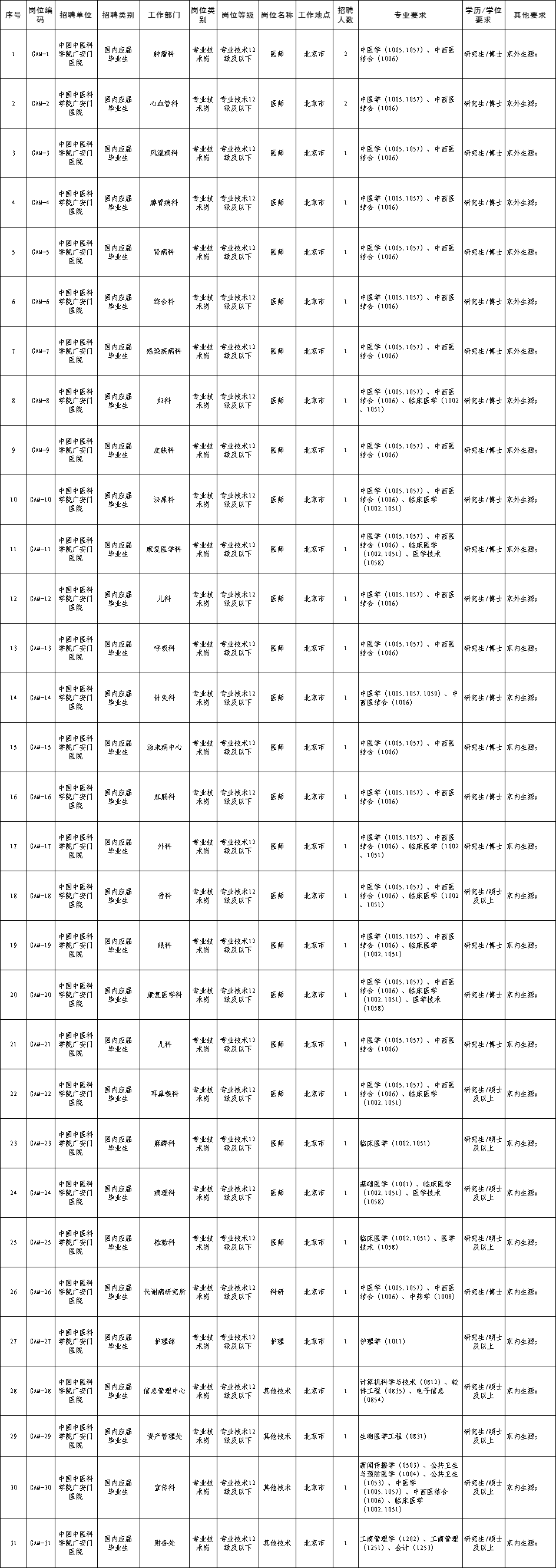 根据工作需要,2025年中国中医科学院广安门医院公开招聘应届毕业生34名。现将有关事项公告如下: