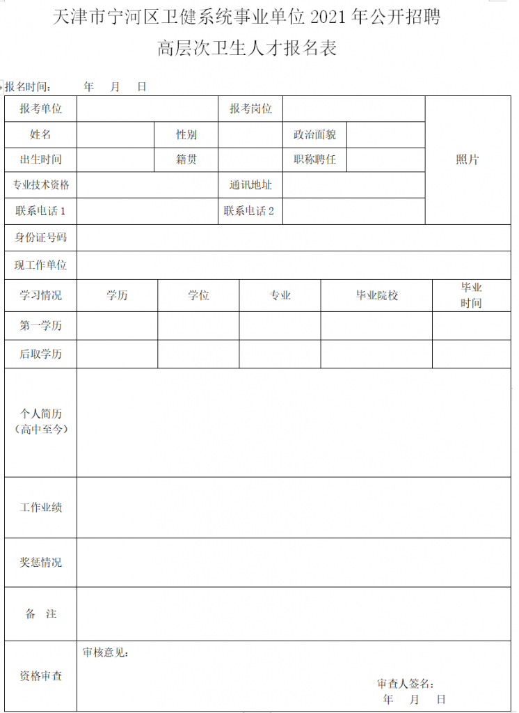 2.《天津市宁河区卫健系统事业单位公开招聘高层次卫生人才报名表》