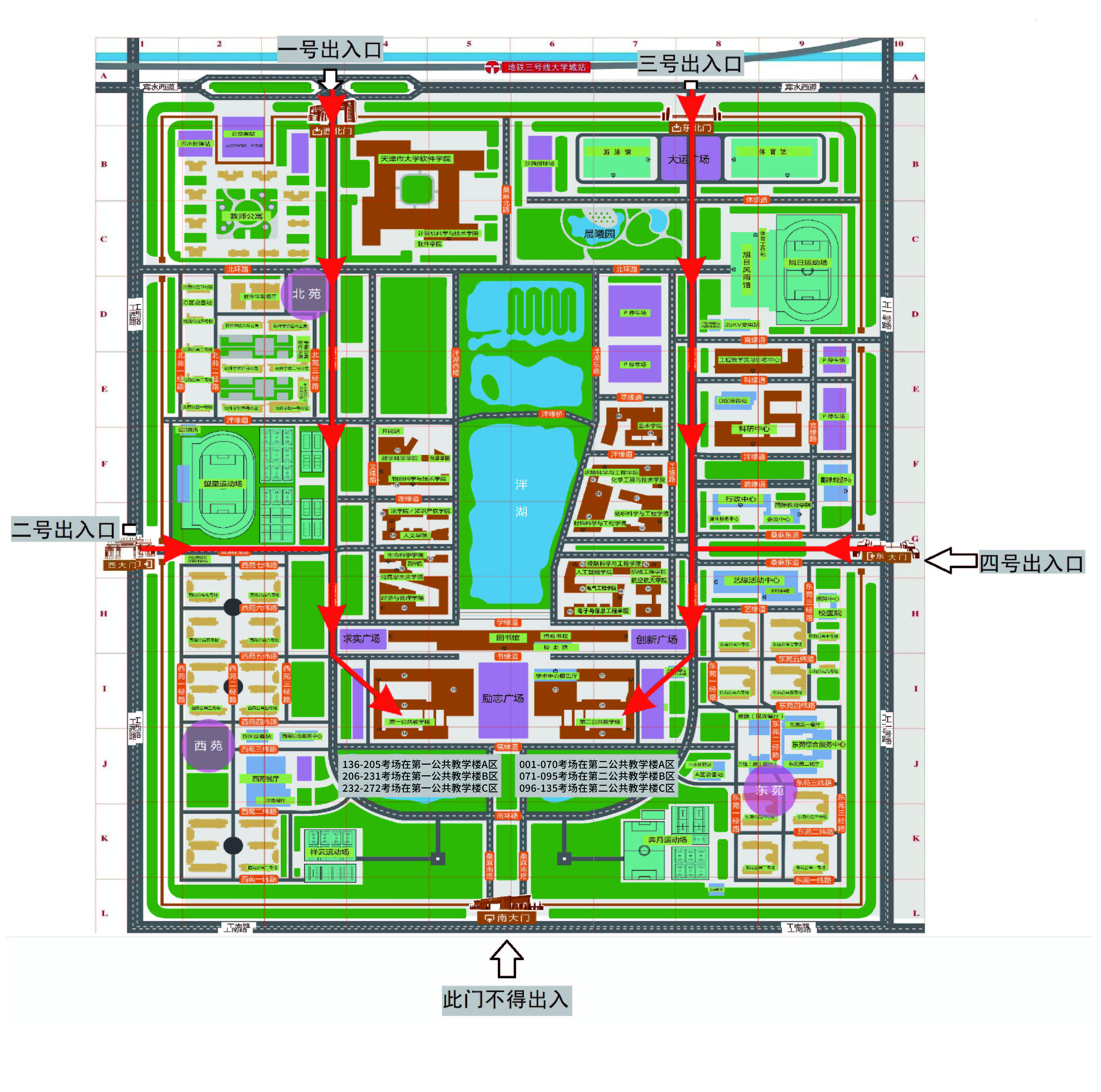 温馨提示:本次考试,考生可从一至四号出入口入校。考生车辆不得入校,驾车考生建议从二、四号出入口步行入校(工业大学东西两侧道路允许单排停放车辆,北侧宾水西道全线禁止停放车辆),乘坐公共交通的考生建议从一、三号出入口步行入校。