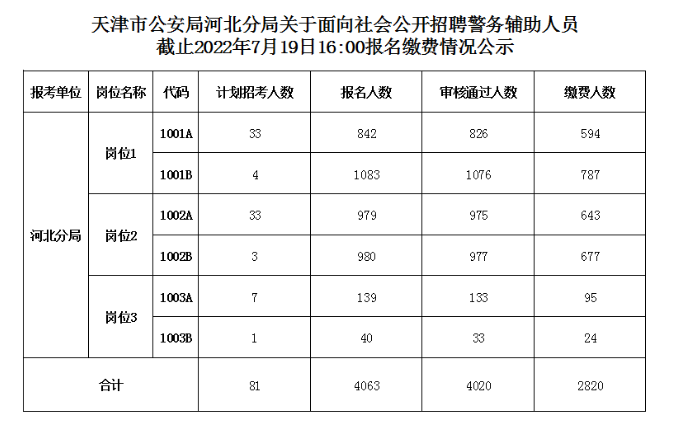天津市公安局河北分局关于面向社会公开招聘警务辅助人员截止2022年7月19日16:00报名缴费情况公示