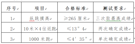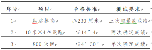 体能测试项目及合格标准如下: