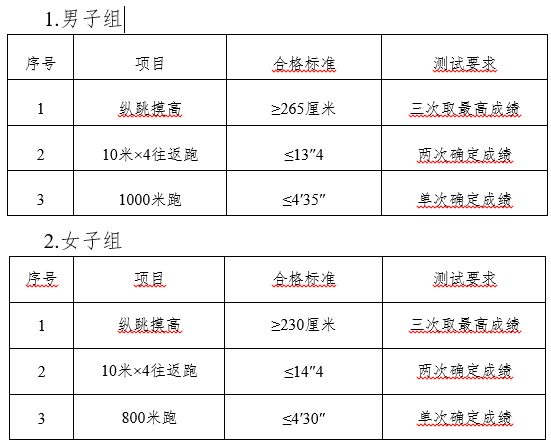 体能测试项目及合格标准如下: