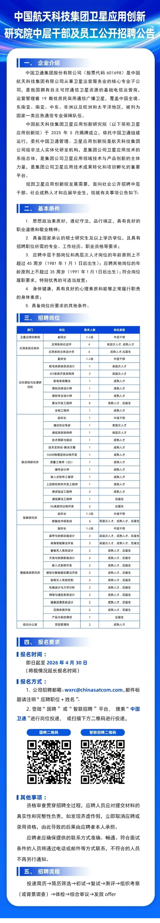 中国航天科技集团卫星应用创新研究院中层干部及员工公开招聘公告