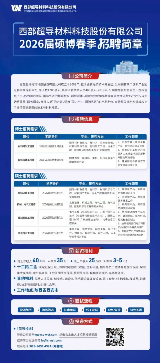 西部超导材料科技股份有限公司2026届硕博春季招聘 时间:2026-04-10 16:46 作者:吴老师 半月讲坛温馨提示:信息均转载自官方网站,仅供参考,不构成相关服务。其最终解释权归相关单位所有,如对信息有疑问,请直接与相关单位联系。转载目的在于信息传递,我司不承担此类稿件其他行为的连带责任,如有侵权或需删除请联系我们。因此带来的不便敬请谅解! (责任编辑:吴老师) 上一篇:中国水利水电勘测设计协会公开招聘 下一篇:财信金控2026“晨星计划”春季全球校招正式启幕
