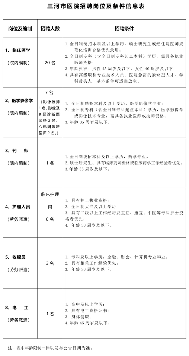 参照《河北省三河市医院招聘岗位及条件信息表》