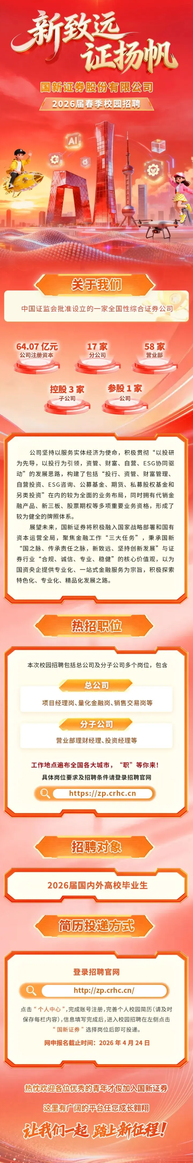 国新证券股份有限公司2026届春季校园招聘 时间:2026-04-17 15:49 作者:吴老师 半月讲坛温馨提示:信息均转载自官方网站,仅供参考,不构成相关服务。其最终解释权归相关单位所有,如对信息有疑问,请直接与相关单位联系。转载目的在于信息传递,我司不承担此类稿件其他行为的连带责任,如有侵权或需删除请联系我们。因此带来的不便敬请谅解! (责任编辑:吴老师) 上一篇:北京北汽科技服务有限公司2026届春季校园招聘 下一篇:北京市法院系统2026年公开招聘聘用制审判辅助人员公告