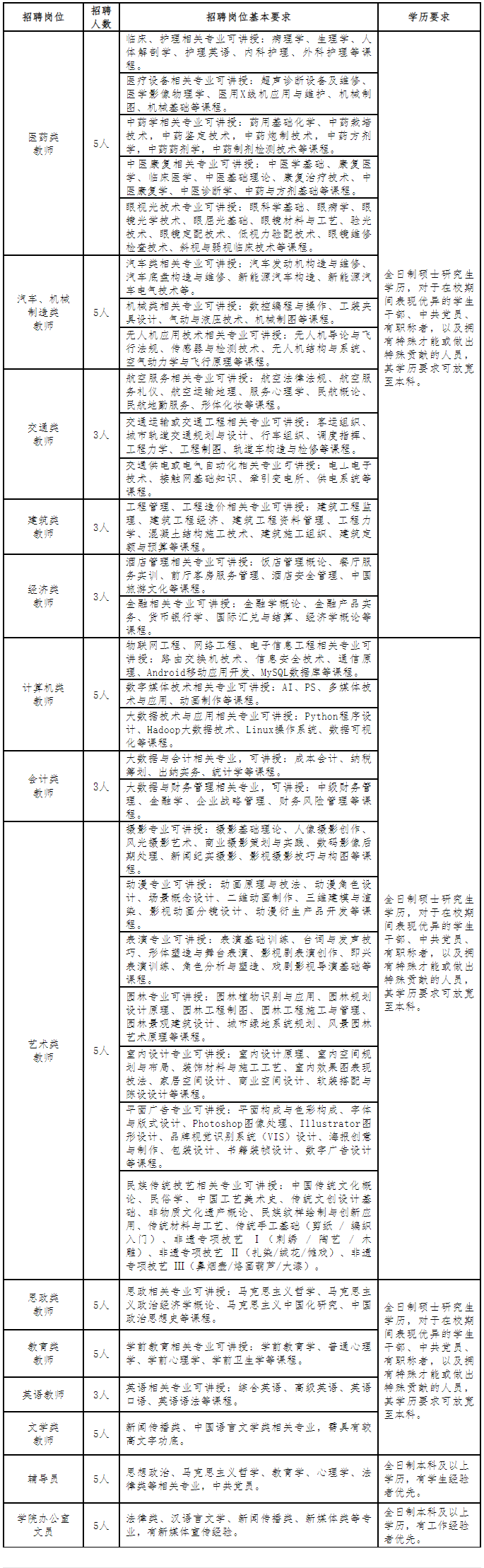 1、教师岗位需全日制硕士研究生学历,对于在校期间表现优异的学生干部、中共党员、有职称者,以及拥有特殊才能或做出特殊贡献的人员,其学历要求可放宽至本科。辅导员岗位、办公室文员岗位需全日制本科及本科以上学历。