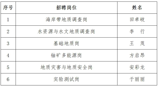 根据《中国地质调查局局属单位2026年度公开招聘工作人员公告(第一批)》相关要求,经个人报名、资格审查、笔试、面试等程序,等额确定6名考生为各招聘岗位考察对象,现将考察对象名单公布如下: